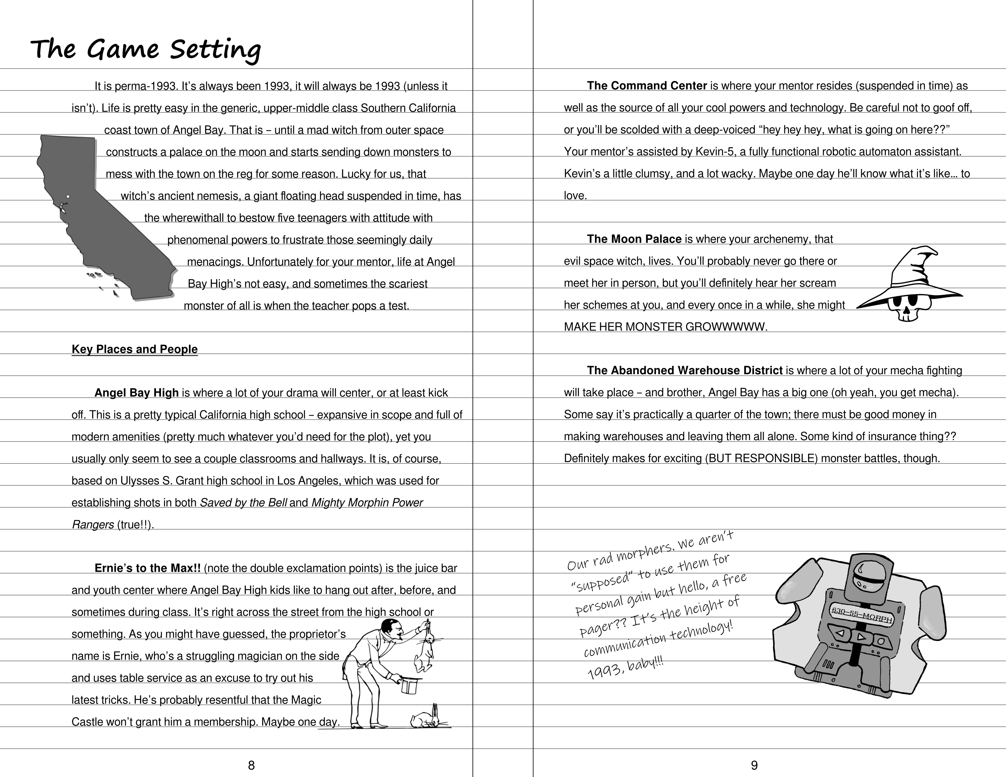 Saved by the Morph, too, is pretty obviously a piece of media exploration alongside a system-agnostic game setting, excavating a connection between two iconic ‘90s teen shows as well as how media of the Super Sentai persuasion in particular provides its heroes such a tasty, unsubtle formula for working through whatever anxieties they feel each week.