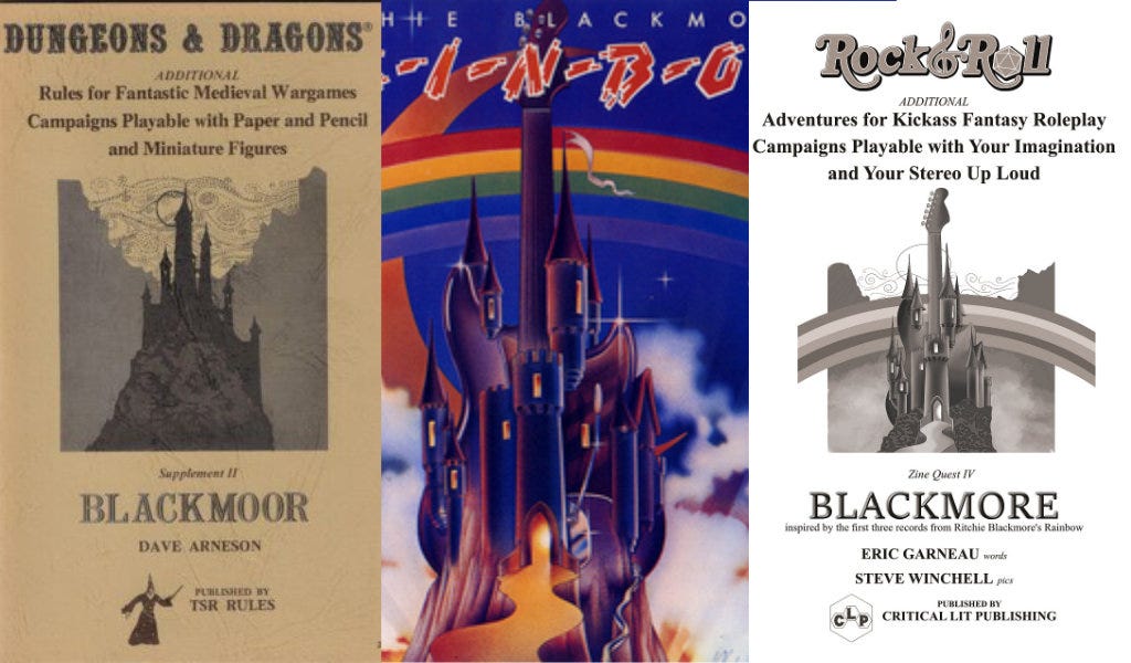 You can see that goal manifest, I hope, in a lot of what I’ve put out so far — Blackmore, for instance, was advertised as an object that merged the earliest D&D modules with the earliest power metal records. In telling a story of a group of fantasy adventurers who end up being trapped by a powerful spellcaster in the mundane real world, it also tracks my experience of listening to those first three Rainbow records that start out magical and, by the time of Long Live Rock ‘n’ Roll, left me feeling wildly disappointed and confused that I had to ask “wait, why is Dio singing about trains?” (BTW, Kieron hipped me to the fact that the original Blackmoor module is an isekai starring adventurers from the real world — accidentally double-clever of me, then, to make Blackmoor a reverse-isekai.)
